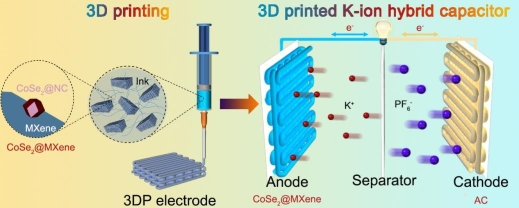 (2)该团队在期刊《Chemical Engineering Journal》(影响因子:15.1,中科院大类一区)上发表题为“Customizing CoSe2/Ti3C2Tn MXene hybrid inks toward high-energy-density 3D-printed K-ion hybrid capacitors”的研究论文。该研究基于3D打印技术结合CoSe2@Ti3C2Tn MXene负极材料构筑钾离子混合电容器,具有高能量密度和长寿命。质量能量密度高达199 Wh kg-1,循环6000圈后容量保持率为84.8%。这项工作将为开发稳定、安全、可靠的钾离子混合电容器开辟一条新的路径,并且可以推广到其他金属离子混合电容器。硕士生刘文峰为论文的第一作者,李亚运副教授为独立通讯作者,6165金沙总站官方入口为第一完成单位。